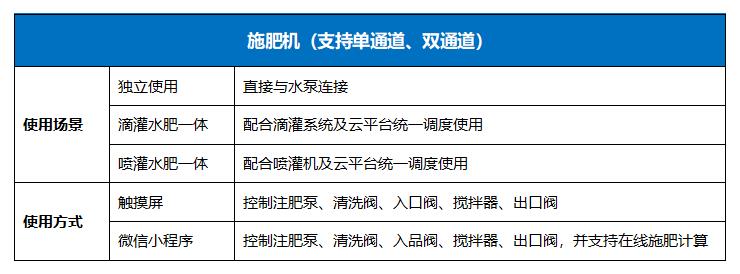 由兩部分組成:泵注入式施肥裝置和施肥控制系統。運用物聯網、大數據、雲計算與傳感器技術相結合的方式,隻需在觸摸屏上輸入肥料等相關參數,系統便能根據所需的施肥量輸出計算結果,指導用戶進行高精度和高施肥均勻性的水肥一體化作業。也可以直接手動控制注肥泵、攪拌器等硬件設備。